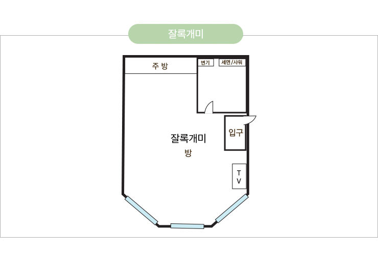객실형태 : 원룸형, 온돌룸1개, 화장실1개